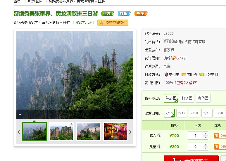 推荐理由:接站服务:提供免费接站服务(若提前一晚抵达,可代预订酒店);全程无购物,无强迫性自费项目,让你的旅程不受被宰的困扰;景点独特:包含精华的袁家界,天子山,金鞭溪等景点; 娱乐活动:入住武陵源镇 ...