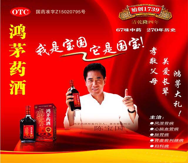 鸿茅药酒由著名影视明星陈宝代言,内蒙鸿茅集团精心研制,自一七三九年创始至今,鸿茅有幸跨越了四个世纪,十八世纪悬壶制方,十九世纪清廷珍贡,二十世纪创业扬名,二十一世纪前程似锦。二百七十年来,鸿茅改写了传统药酒数千年沿袭的泡浸之法,向世人展示了中医鸿术大方的济世奇功,赢得了“喝鸿茅,百病消”的美誉。鸿茅药酒方出自清代乾隆四年(公元1739年),是中国用药最多的中药复方酒剂。本方药物众多,包括有祛风燥湿药、通经活血药、温里助阳药、芳香开窍药、温化寒痰药、健脾和胃药、补气养阴药和滋阴壮阳药等十八大类六十七味药;方中多证兼顾,数法并备,各种药材珠联璧合,祛风湿寒邪而不伤正,扶正气而不滞邪,适用症极广,功效以治疗风寒湿痹、筋骨疼痛、脾胃虚寒、肾亏腰酸及妇女气虚血亏等症为最,饮之每奏奇效,数百年来历久不衰。1997年,鸿茅处方和制法被载入《中华人民共和国药典》。鸿茅药酒,不愧为国宝酒!