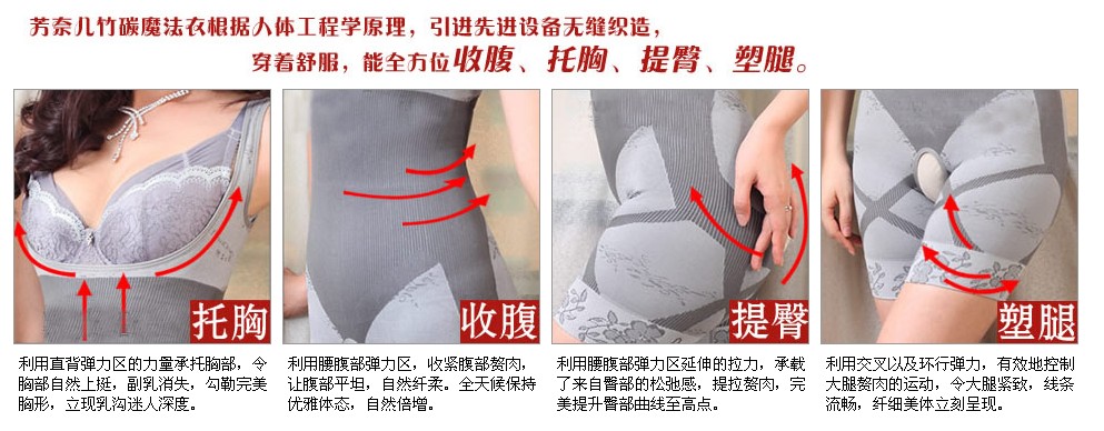 芳奈儿竹碳魔法衣/15段塑身自弹力区,收紧赘肉/1分钟四大功能快速塑造完美体态/动感移脂设计+独特精密织造+立体裁剪/撑起腰线,看见曲线,塑造性感三围