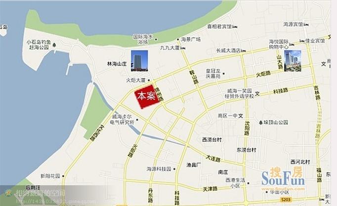 威海市高技区火炬大厦(高区管委会)对面。呈品字型排列的26层高层建筑,地理位置优越。威海是我们国家第一个卫生城市,园林城市,是世界上最适合人类居住的范例城市,以轻工业和旅游业为支柱产业。这里是我们国家陆海交接处最东端,是大陆伸进黄海最远的地方,低山的地貌绵延着1000多公里的海岸线使这个小城风景秀丽气候宜人。三面环海的地理位置决定这里具有典型的温带海洋性气候的特点。冬无严寒,夏无酷暑。年平均温度12℃,年降水量800毫米。这样的气候条件是最适合人类和动植物的生长,因此联合国人居署把威海定为最适合人类居住的范例城市。每年要在威海举办人居会议。
