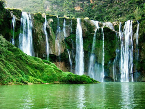 九龙瀑布群,位于罗平县城东北22公里的九龙河上,九龙河从白腊背后的群山中呼啸着奔腾而来,养育着罗平大地上的各民族儿女。相传,当年神龙在这里大胜铜鼓精,从此镇守这方水域,护佑这九龙河两岸的人民。由于得天独厚的地质构造和水流的长期侵蚀,在此形成了十级高低宽窄不等、形态各异的瀑布群,或雄伟、或险峻、或秀美、或舒缓、美不胜收、绝伦无比。瀑与瀑之间有无数的浅滩和深潭,各显丰姿。大大小小的瀑布,或细柔若丝,仿佛一根根丝线在随风飘舞,或水花翻滚,波光闪烁,或似天河泻落,势如雷霆万钧,震撼山河,或鱼群弄瀑抢水,景致迷人……