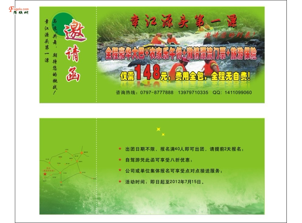 全程豪华大巴+农家乐午餐+激情漂流门票+旅游保险=148元