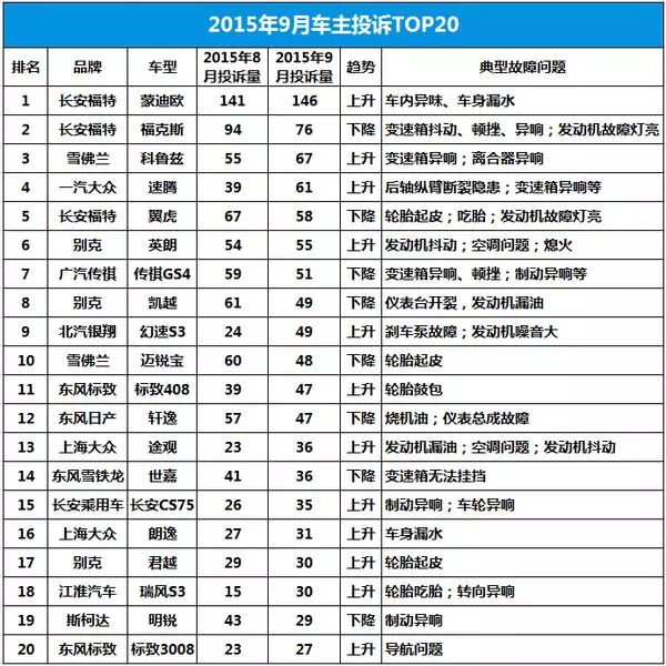 根据中国汽车质量网2015年9月份投诉数据统计,9月投诉TOP20车型排名如下: 长安福特一骑绝尘 从投诉品牌来说,长安福特遥遥领先,旗下车型蒙迪欧、福克斯、翼虎位列榜单前五位;其次是上海通用雪佛兰,科鲁兹、迈锐宝投诉也不少;然后是上海大众,途观、朗逸两款车型都在列。 典型车型解读: 1、蒙迪欧与福克斯 这对兄弟以绝对领先的优势位居榜单的前两位。蒙迪欧最大的槽点是异味问题,不仅导致车内环境不好,更可怕的是异味的背后极可能是甲醛及TVOC等有毒有害甚至是致癌物质的侵入。福克斯以“变速箱漏油、异响、抖动、发动机故障灯亮”等各种问题不断累积,不折不扣的将自己打造为“烂车王”。 2、速腾 速腾断轴投诉9月比8月增加了21宗,尽管一汽-大众针对速腾后桥断裂给出置换车、主动召回、赠送3次基础常规保养等措施,但依然不能消除部分车主的不满情绪,毕竟安全问题无小事,一汽-大众想要挽回客户满意度可谓压力山大。 3、传祺 GS4 4月上市的广汽传祺GS4,上市后销量直线上升,200T发动机+7速DCT动力是其最大的卖点,9月份51宗投诉均与变速箱问题有关,除手动变速箱出现换挡异响问题外,被赋予同级领先水平的7速DCT变速器,也遇到低速行驶顿挫感强的问题,在拥堵路段行驶令车主难以忍受,严重影响到日常驾驶体验。 4、幻速S3 本月幻速S3进入投诉前十,车主投诉依然集中在刹车行程长、偏软问题上。据了解,北汽幻速S3 2015款车型上使用的制动系统已经升级,但14款幻速S3的制动效果如何达到车主的期望,还需要厂家认真处理。 5、长安CS75 CS75因为外形好看、较强的竞争力而深受车主们喜爱,销量更是出现大幅上涨。然而该车的各种“异响”一直为广大车主所诟病,包括刹车异响、中控异响、油箱异响、减震异响、变速箱异响等等,而且并非个例,论坛里相关投诉也不少。最让车主郁闷的是经过多次维修,问题也始终没有解决。 6、江淮S3 9月比8月投诉量翻倍的增长,转向异响问题的抱怨相对集中。车主反映新车购买后不久,发现在颠簸路面行驶时,电动助力转向系统异响,多次到4S店维修检测但都无功而返,希望厂家能尽早拿出切实可行的解决方案。 结语: 按照一般规律,销量大投诉量也会相应的较多,不过在这个榜单上并未看到SUV销量冠军哈弗H6的身影。据悉,10月9日,中国质量协会、全国用户委员会在京发布“2015年汽车行业用户满意度测评结果”。15万以下A级SUV满意度,哈弗H6排名第一。这说明哈弗H6的产品品质获得市场认可。 小编认为,各车企在推新品的同时,千万不能忘了切实改善产品的质量、提高客户的满意度,这才是赢得客户的根本。