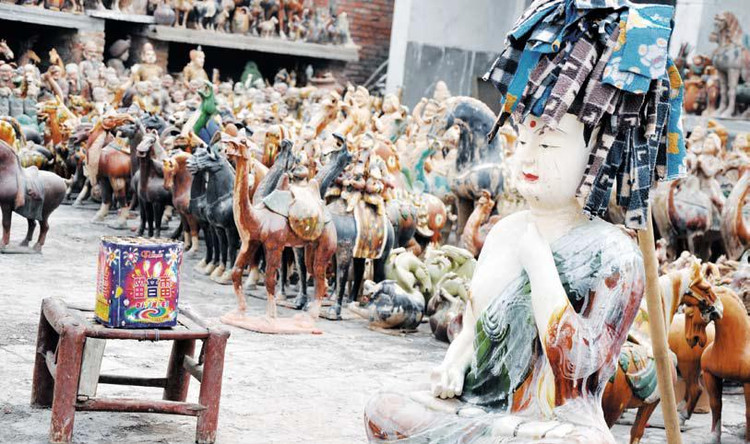 洛阳经常出现这样一幕,某地一个藏家找到了洛阳的盗墓团伙,准备收购他们手中的文物,然后盗墓者领着藏家来到一个刚打好盗洞的古墓前,将其带入墓室中,把带着泥土的“文物”卖给对方。 其实,这是一个骗局,墓里根本不是真的文物,而是当代人做的高仿品。 洛阳的高仿,在中国非常出名。流传最广的一个故事是,1994年夏天,北京潘家园古玩交易市场上,冒出了一批北魏时期斑驳古旧的陶俑。 北京故宫博物馆和中国历史博物馆的专家们一致认定,这些陶俑就是北魏时期的陪葬品,文物价值极高,于是两家博物馆分别拨80万元和10万元专款抢救这批文物。 但潘家园的北魏陶俑却越买越多,而且价格越来越便宜。后来才知道,这些东西出自洛阳孟津县南石山村农民高水旺之手。 高水旺的仿制技术来自祖传,已经达到了专家鉴定和仪器测验都认为是真品的地步。这些仿制品在机场经过X光机的安检时,每秒能将釉面老化程度提早200年左右。多过几次光机,仿唐的就变成了仿汉的。通过三种X光照射,机器就再也鉴定不出来。 高水旺后来在村里开设了一家九朝文物复制品公司。该村能做出同样高仿文物的大有人在,二三十户农民办有高仿作坊。